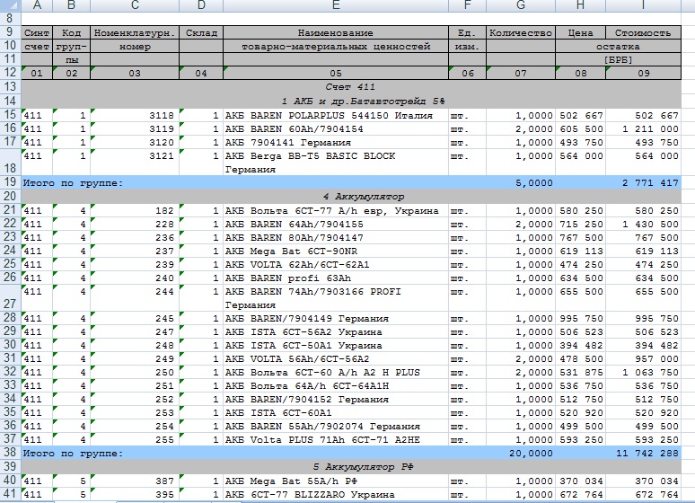 Загрузка остатков товара (сч 41) из файла xls в 1С 8.2 Бух РБ