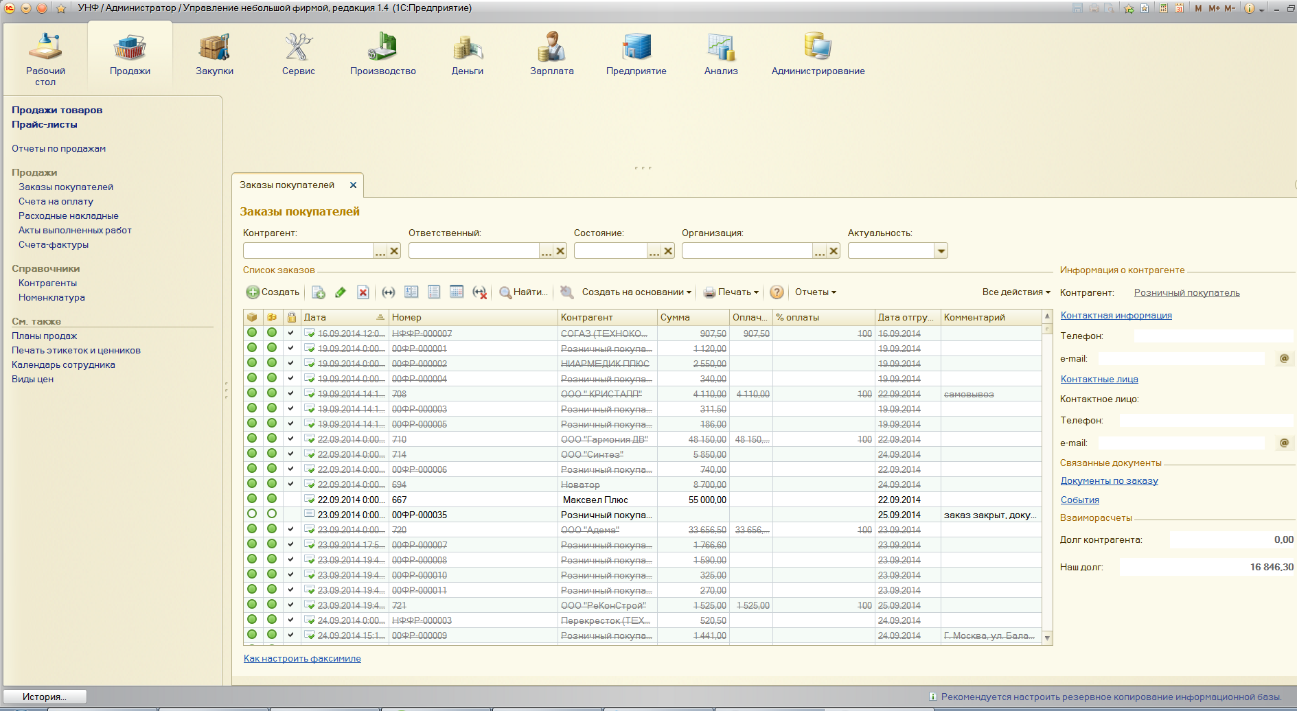 В списке документов "заказы покупателя" при формировании документов на оплату (поступление на счет, поступление в кассу) в строках Оплачено и % оплаты не отображается в некоторых документах, при этом в других документах строки заполняются при формировании тех же документов.