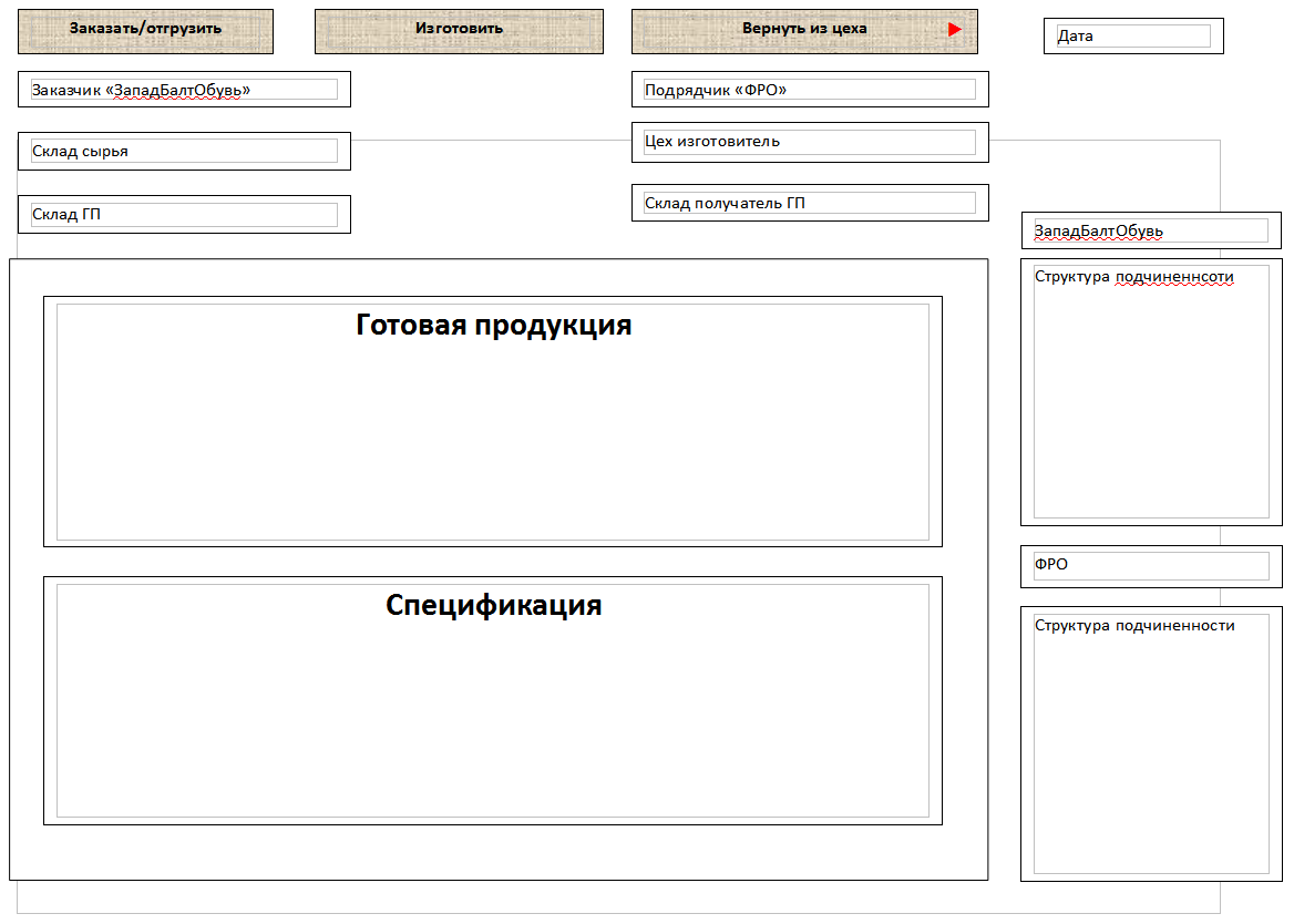 В группе компаний существуют 2 организации.На 1 «ЗападБалтОбувь» приходуется сырье на 2 «ФРО ЗБО» изготавливается обувь. У организации «ФРО ЗБО» есть 3 производственных цеха (Медовое,Высокое, Советск). Организация «ЗападБалтОбувь» делает заказ на производство «ФРО» в определенный цех. «ФРО» в тот же день изготавливает продукцию и возвращает обратно «ЗападБалтОбувь».