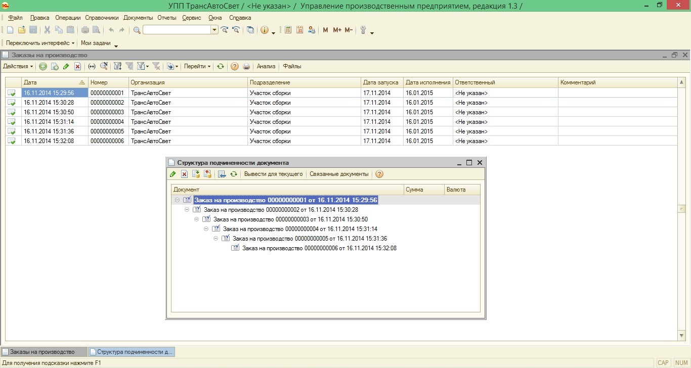 Для демонстрации нашей проблемы был создан основной заказ на производство №00000000001 и подчинённые заказы на производство №00000000002-00000000006 (см. файл "Подчиненные заказы на производство" во вложении. Файл демонстрирует структуру подчинённости заказов).