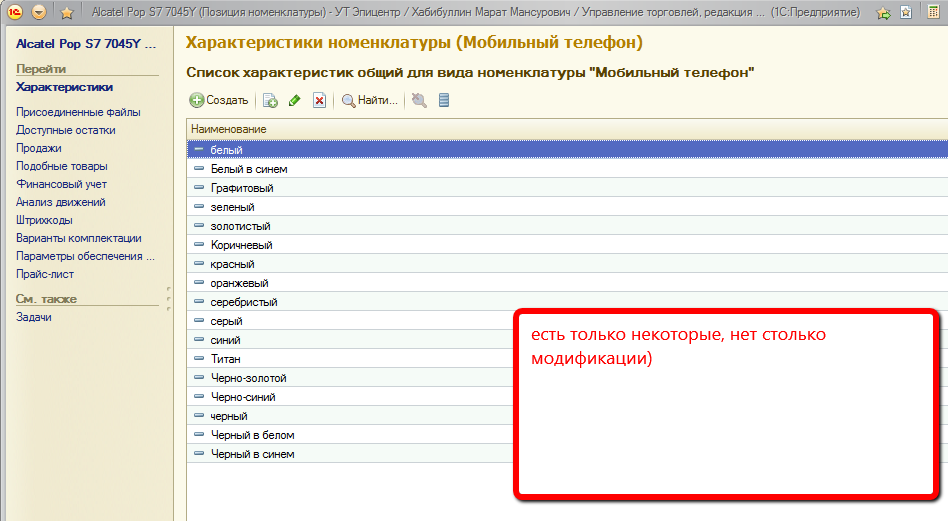 В 1С УТ 11.1 (11.1.9.70) у вида номенклатуры телефон было установлено использование характеристик для "общего", по цветам.