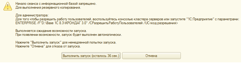 Добрый день! Необходимо восстановить запуск 1С. Вчера при завершении сеанса 1с выполнили резервное копирование базы. В ходе резервного копирования выдало ошибку о том, что не хватает места на диске. Копирование закрыли. Сегодня при открытии базы выдало ошибку о невозможности открытия до завершения копирования (см.вложение). Прошу помочь в воставлении доступа. Спасибо.