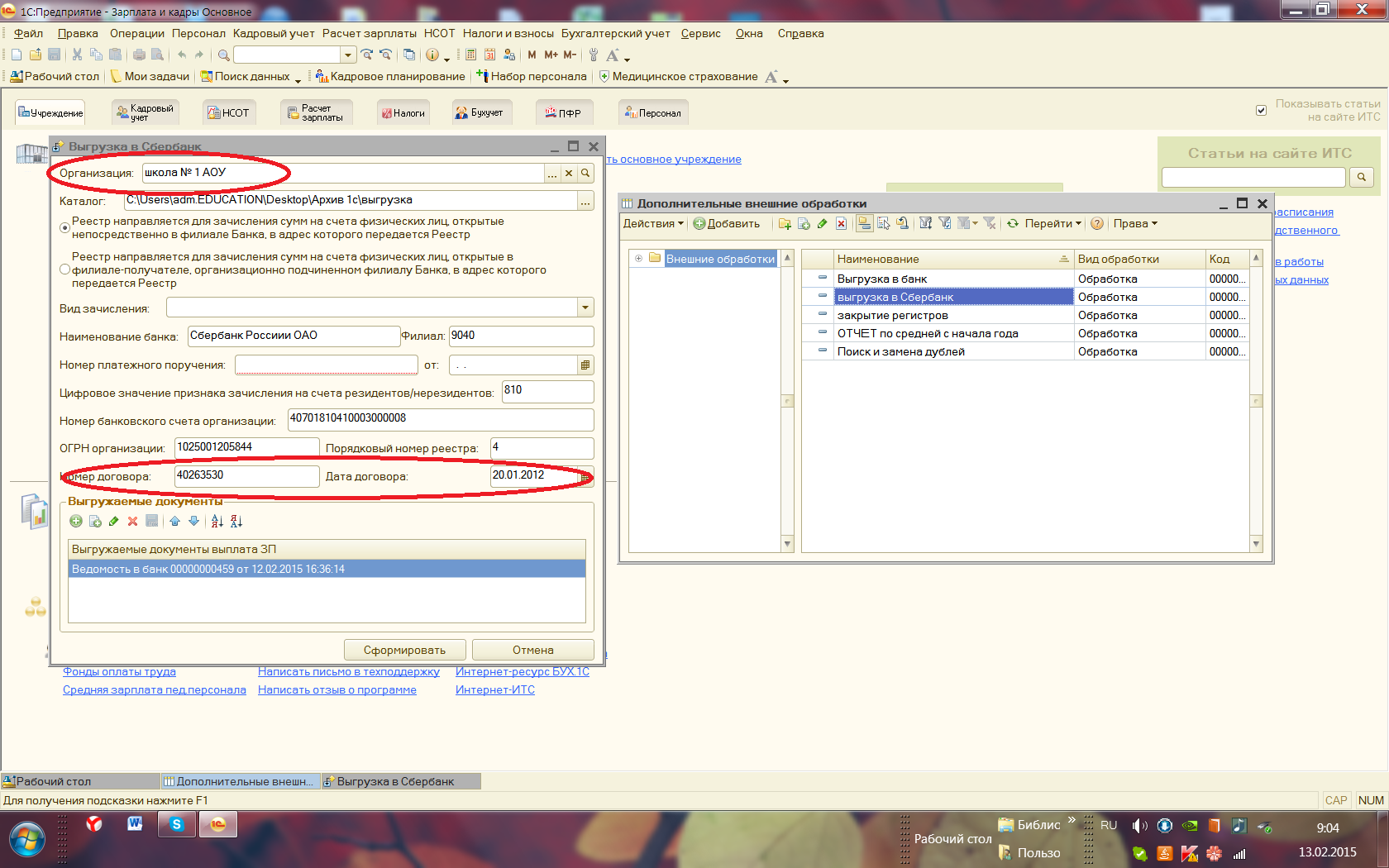 1. Во внешней обработке "выгрузка в Сбербанк" номер договора со Сбербанком приходится для каждой организации менять вручную. Нужно привязать номер договора к организации. Надо, чтобы к каждому учреждению был привязан номер договора со Сбербанком. Чтобы при выборе учреждения в обработке сразу же появлялся номер договора и его дата, также как р/счет и ОГРН.