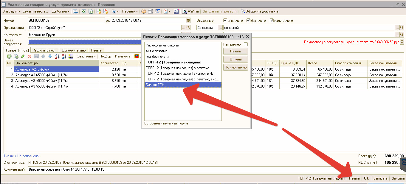 Есть обработка, из таблицы которой открывается документ "реализация товаров и услуг". В документе есть печать бланков ттн.