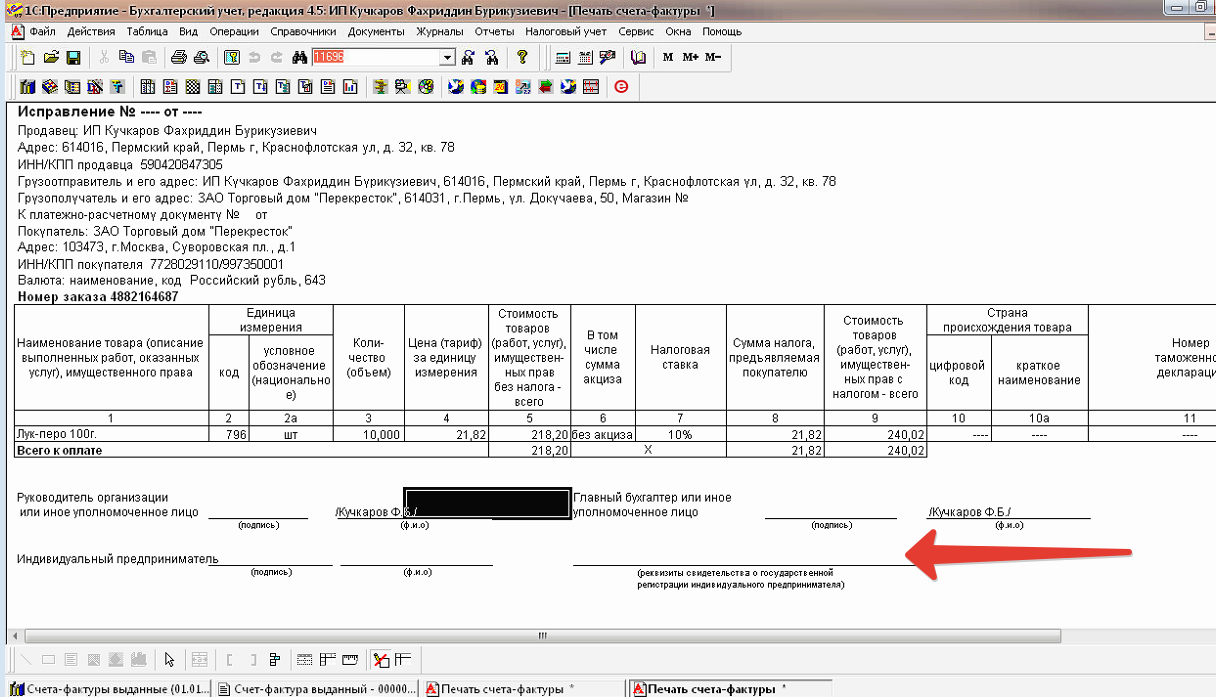 Во вложении сркин - не заполняется в печатной форме счет-фактуры фио ип и ОГРНИП