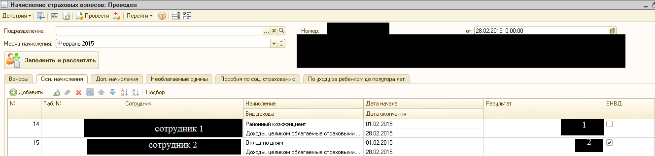 При заполнении РСВ-1 в ПФР за первый квартал 2015 в раздел 2.1 в строку 200 попадают только сотрудники, у которых в документе начислении стоит галочка ЕНВД. Если сформировать за первый квартал 2014 попадают все сотрудники из документа начисления.