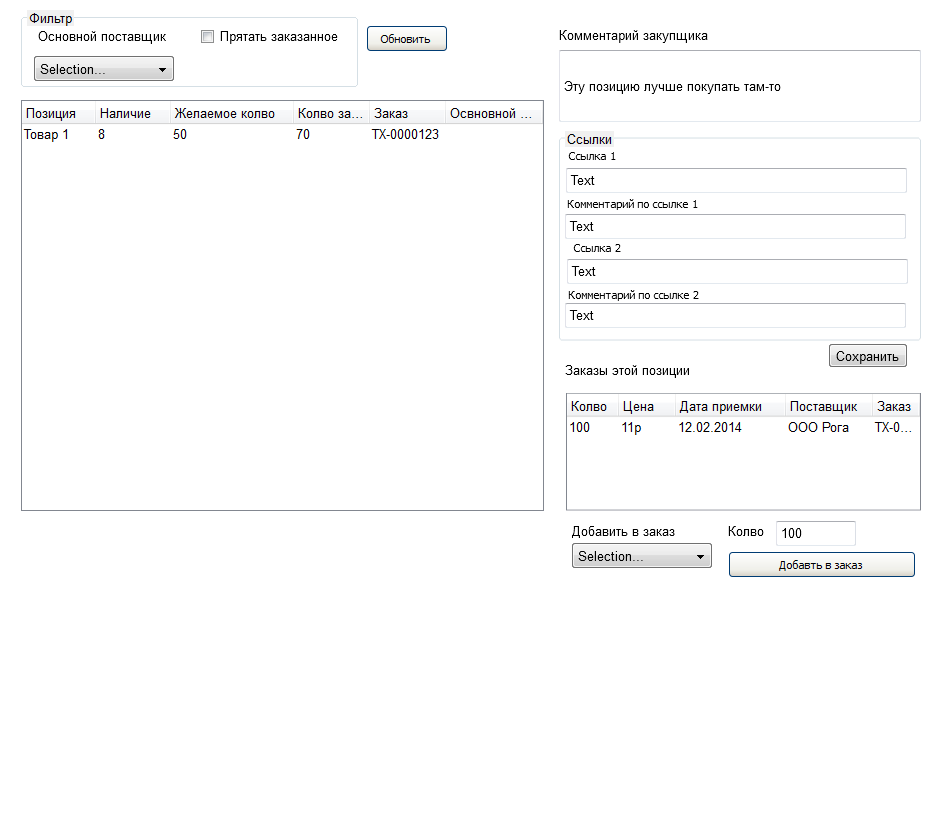 Обработка показывает список товаров, рекоммендуемых к закупке на основании доп.свойства номенклатуры "Желаемое количество на складе" и доступного количества на складах. Фильтр по допсвойству номенклатуры "Основной поставщик". Показывает список заказов выбранного товара. Позволяет добавить товар в выбранный заказ.