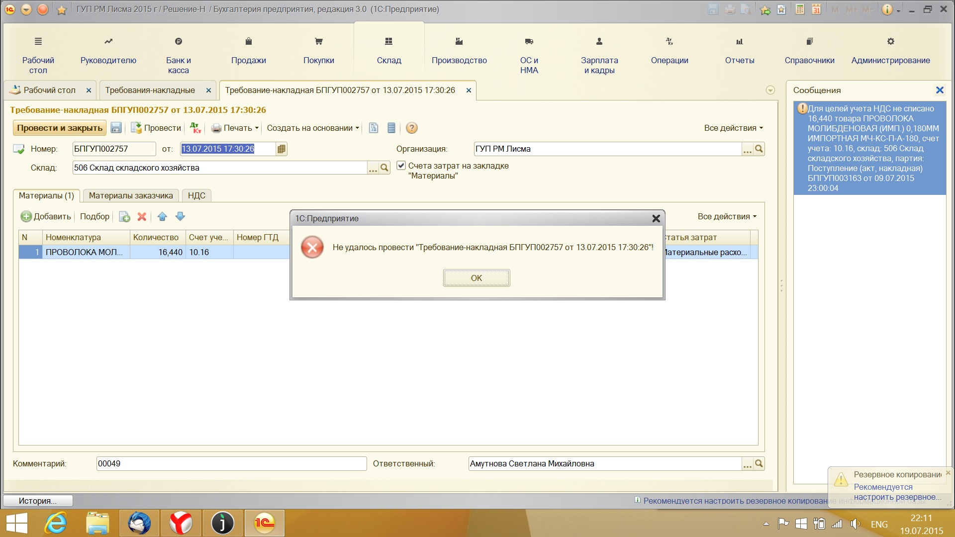 Сделали свертку базы бух 2.0. Перевели на 3.0. После свертки возникла ошибка с проведением и перепроведением документов(текст ошибки "Для целей учета НДС не списано 16,440 товара ПРОВОЛОКА МОЛИБДЕНОВАЯ.........."(скрин1). В организации ведется раздельный учет входящего НДС.(скрин2) Если в учетной политике галочку снять, ошибка исчезнет, но это неправильно, так как описал выше "В организации ведется раздельный учет входящего НДС". Может кто сталкивался с подобным. Требуется специалист, готовый решить проблему. Скрины во вложении.
