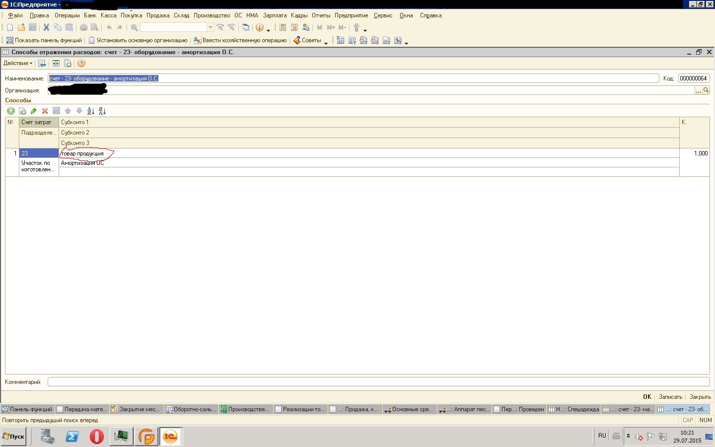 Организация осуществляет производство некой продукции, параметры производства в учетной политики по выручке + по объему выпуска, метод директ-костинг, без использования 40 счета. Далее бухгалтера хотят видеть аналитику по нгп, создают множество нгп соответствующей выпускаемой продукции, они запутались и получилось следующее. Бухгалтера принимают к учету ос со следующим способом отражения расходов на амортизации рис.1 в нескольких месяцах выпускается продукция с указанной нгп, приходит месяц и они не выпускают продукцию по указанной в рис.1 нгп, соответственно 23 счет оставляет сальдо по начисленной амортизации, бухи говорят что так быть не должно, потому что они делают передачу материалов в эксплуатацию по данной нгп рис.2