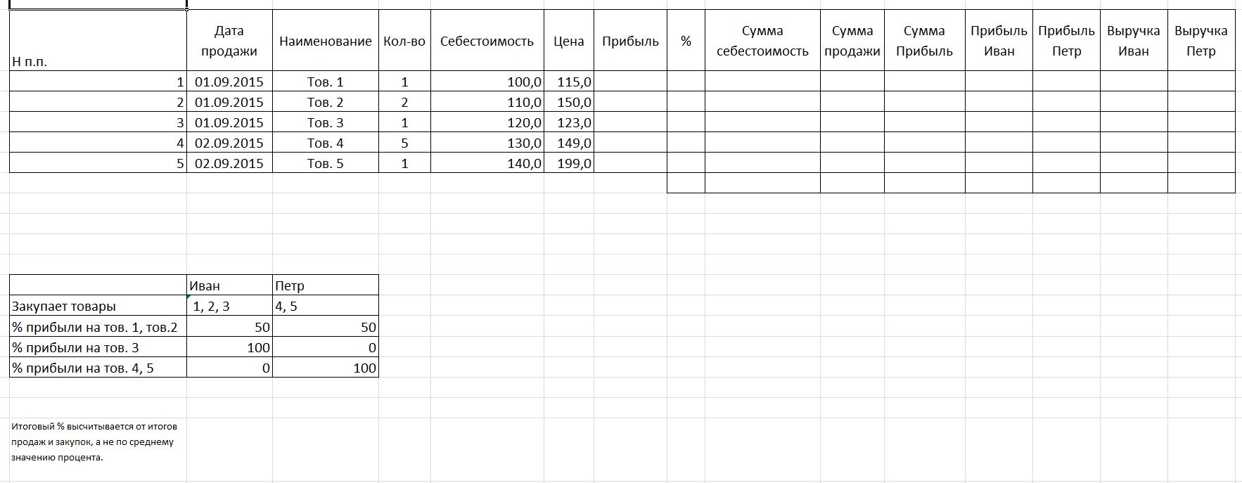 Возможно, я что-то описал запутанно, поэтому добавлю простыми словами. Торговля ведется совместно несколькими людьми. В конце дня в excel вручную ведется распределение выручки, в зависимости от того, кто ведет закупку каких товаров. При этом есть виды товаров, на которые прибыль не делится, а уходит одному человеку. При необходимости уточнения задания – обращайтесь.