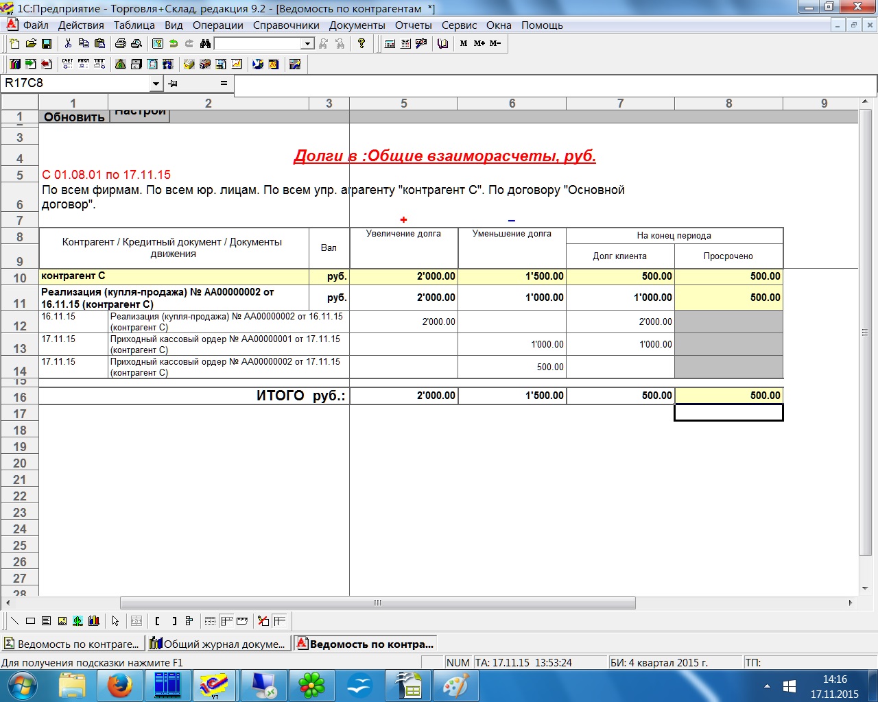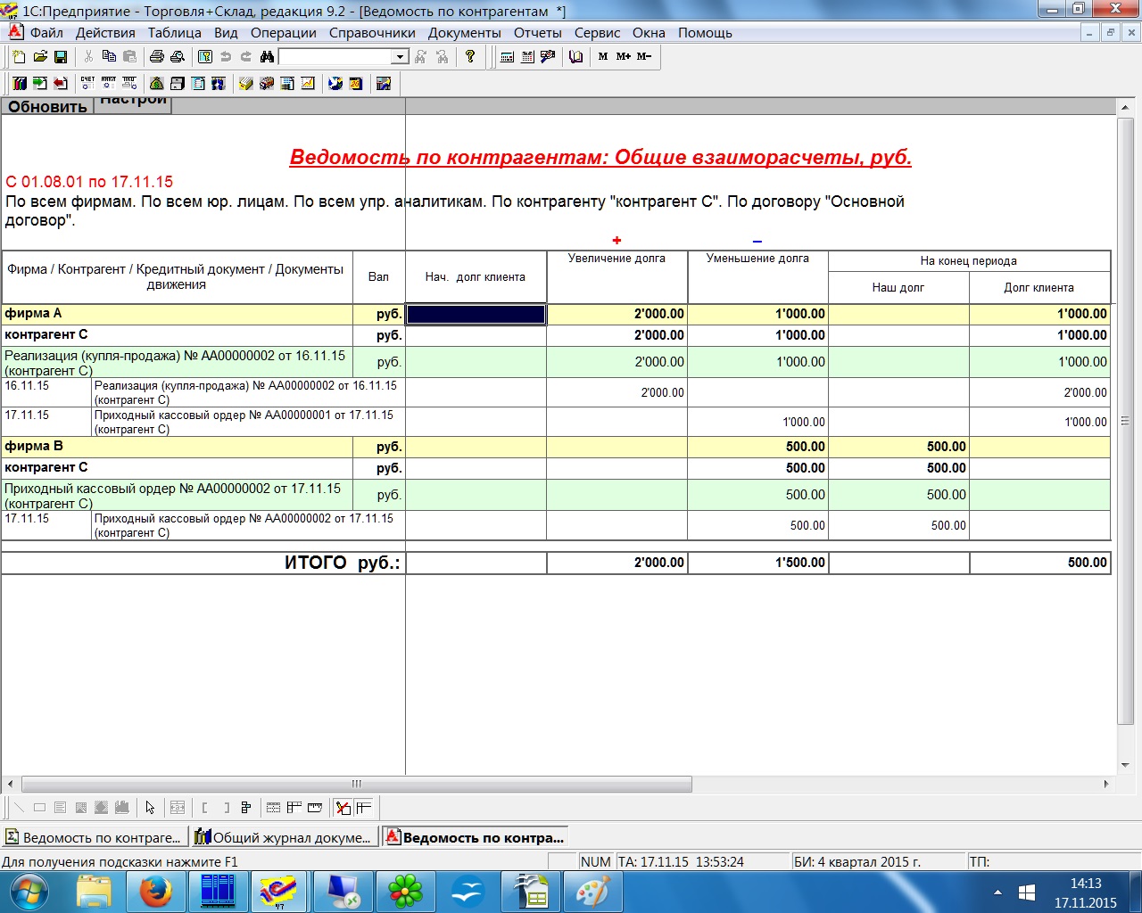 Требуется доработать штатный отчёт "ведомость по контрагентам". Отгрузка от нашей фирмы А покупателю С, оплата от покупателя С возможна нашим фирмам А и В. В отчёте нужно видеть общие (по всем нашим фирмам) взаиморасчёты и просроченную оплату.