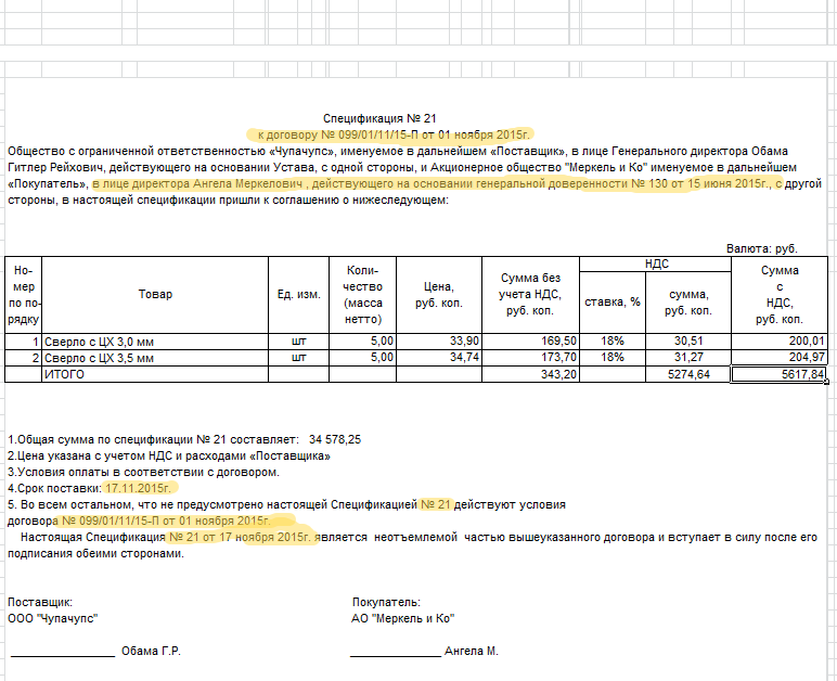 - в нижней части спецификации должно в определенные пункты (на скрине видно) подставляться номер спецификации, ее дата (дата документа реализация), номер и дата договора, а так же сумма