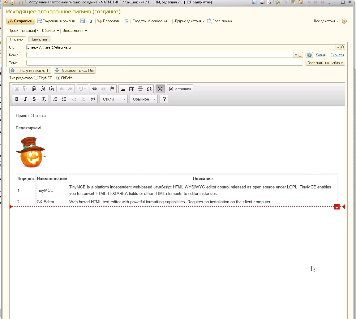 Стандартный почтовый клиент в CRM не поддерживает таблицы. Доработать стандартный или интегрировать приложенную обработку. https://yadi.sk/d/Ek4ccG0qkf8Ax