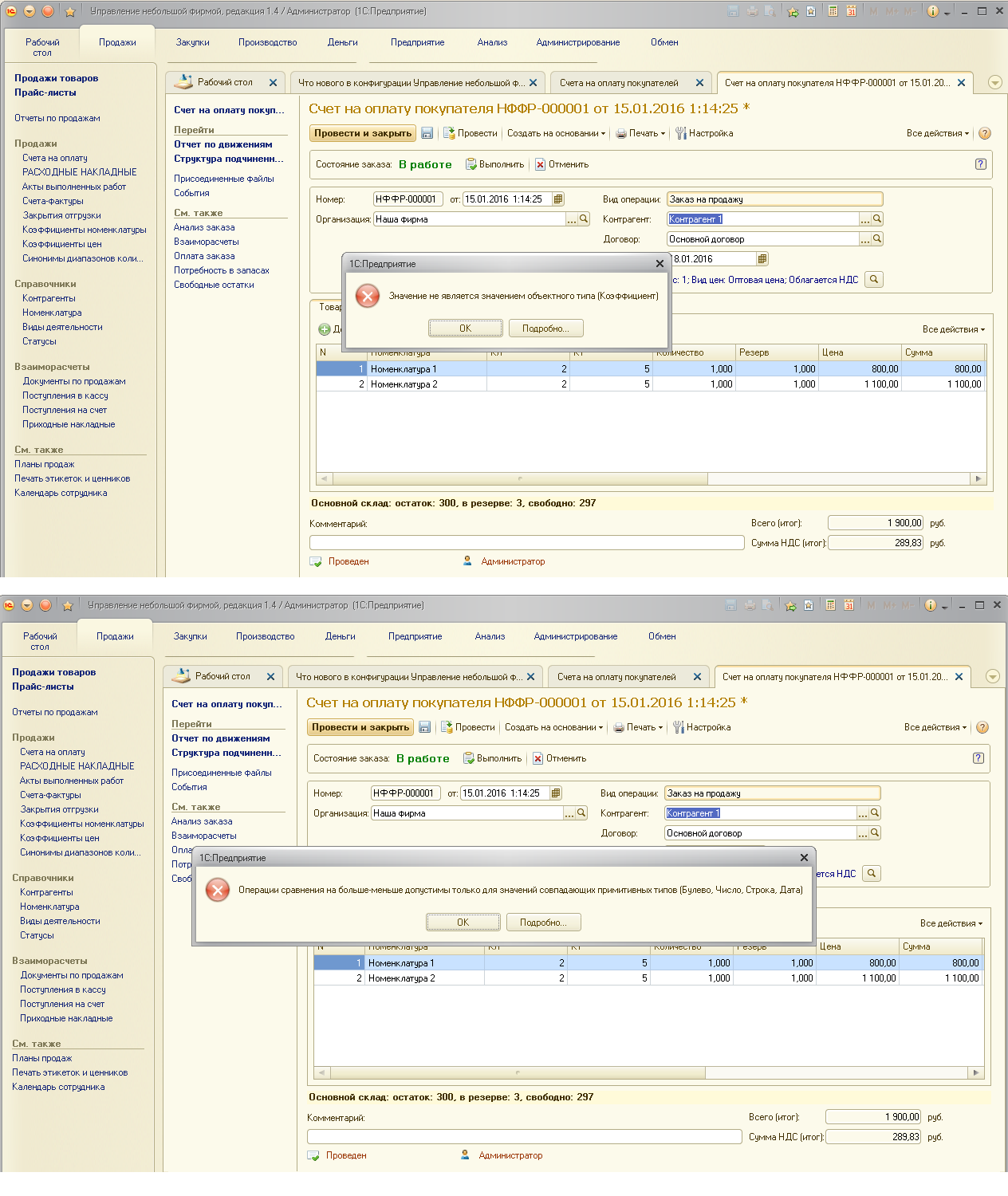 При заполнении Заказа покупателя через подбор при проведении появляются 2 ошибки. Если перевыбрать номенклатуру или добавлять не через подбор, ошибки не появляются.