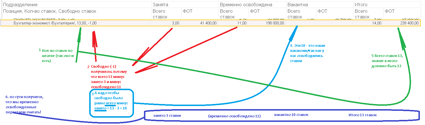 1.2. математику переделываем чтобы временно освобожденные перестали участвовать в формулах подсчета общего фот и кол-ва свободных ставок, и кол-ва вакансий. На картинке более подробно на примере
