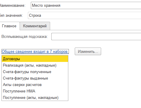 Активно использую дополнительные сведения в документах: договор, акт/накладная, счет-фактура (причем эти сведения в каждом из документе из одного набора см. файл "общий набор"). Периодически нужно изменять значения доп. сведений.