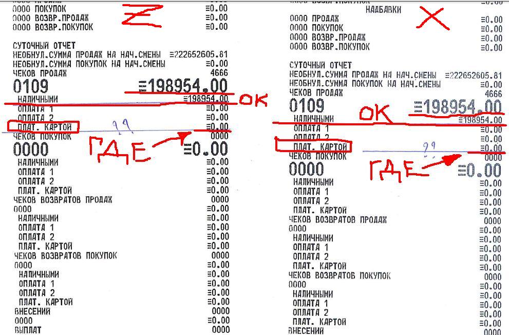 И второе после этого как появится помимо - НАЛИЧНЫМИ ещё и ПЛАТ. КАРТОЙ в чеках ККМ, в ОТЧЁТАХ же уже нужно разделять их и подсчитывать их отдельные общие Итоги по ним и один их общий вместе Итог, уже по НАЛИЧНЫМИ и по ПЛАТ. КАРТОЙ в X и Z отчетах ШТРИХ-Ма. (пример Наличными допустим принято 1000 рублей, Плат. картой к примеру 500 руб. общий итог в X и Z отчетах д.б. 1500 руб. в соответствующих им строках, а по раздельности всего Наличными-1000 р., всего Плат. картой-500 руб., и общий итог по ним 1500 руб.). Данное дело так и должно работать по крайней мере если-в я ничего не упустил то это на скрине - ОтчетыККМ_Z_&_X_как_они_есть_сейчас_у_нас_2стр..jpg в секции примера чека 0109, Наличными столько-то, Плат. картой столько-то и в секции 0109 уже = их общий Итог который так-же в итоге д.б. правильно подсчитан (выведен) и в эти скрины X и Z отчетов - (ОтчетыККМ_Z_&_X_как_они_есть_сейчас_у_нас_1стр..jpg и ОтчетыККМ_Z_&_X_как_они_есть_сейчас_у_нас_3стр..jpg).