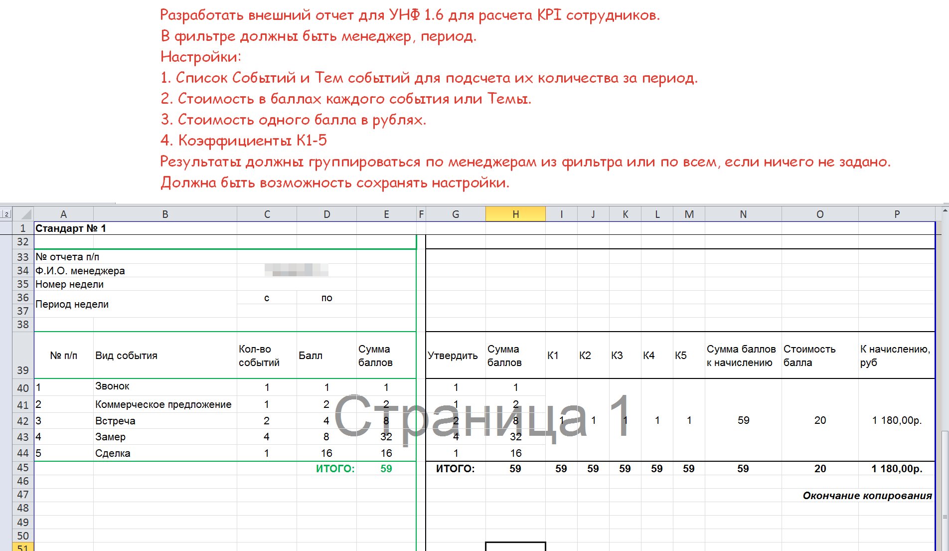 Разработать внешний отчет для УНФ 1.6 для расчета KPI сотрудников. (см. скрин)