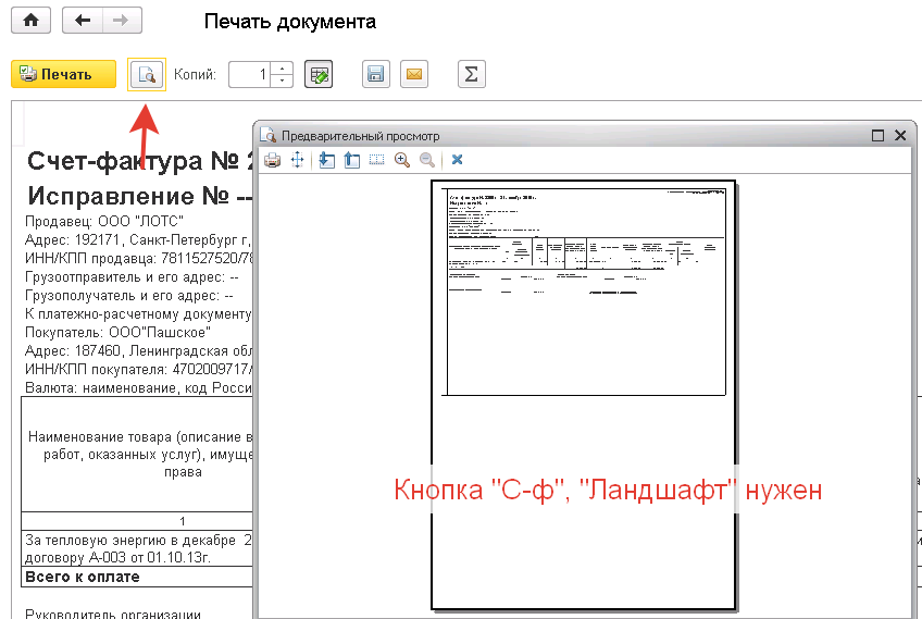 1. При нажатии на "Наша с/ф" выводится на печать и печатается счет-фактура с ориентацией "Портрет", необходимо ориентацию "Ландшафт"