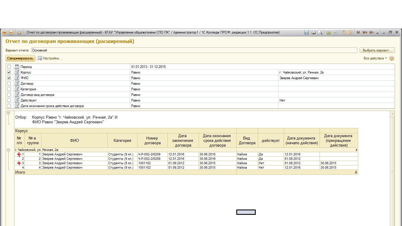 1С Колледж ПРОФ, редакция 1.1 (1.1.4.1): Проблема с отчетом