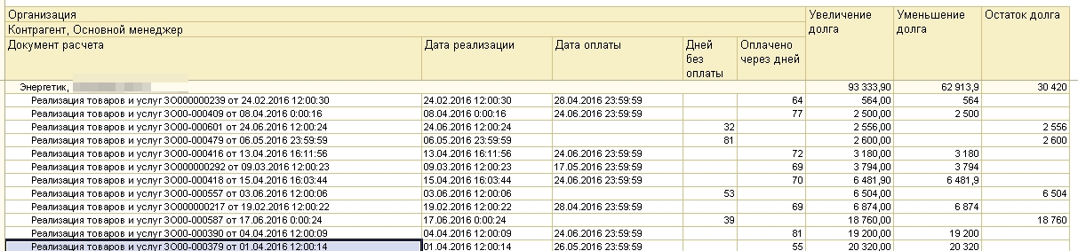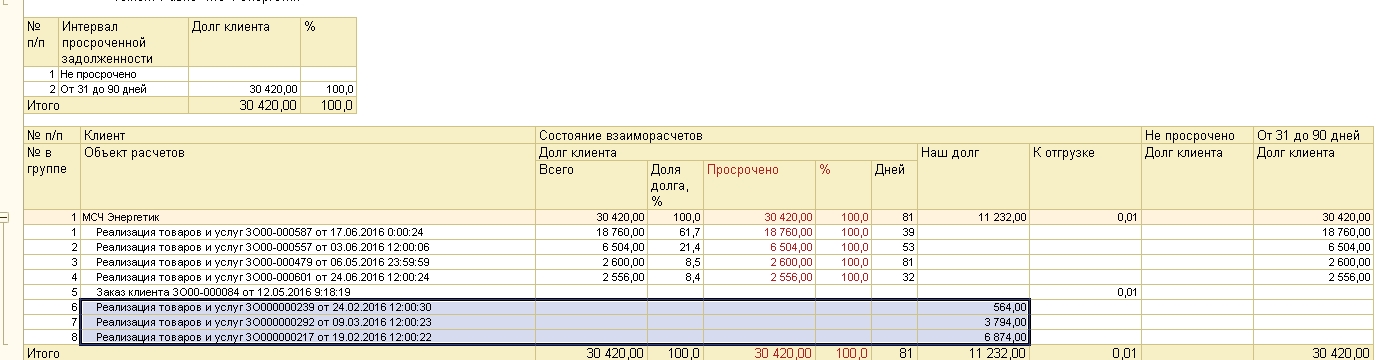 3)какие то реализации вообще не отображаются в данном отчете, для ясности прикрепил 2 картинки, 1ая из отчета "задолженность клиентов по срокам" вторая, ну скажем как на самом деле