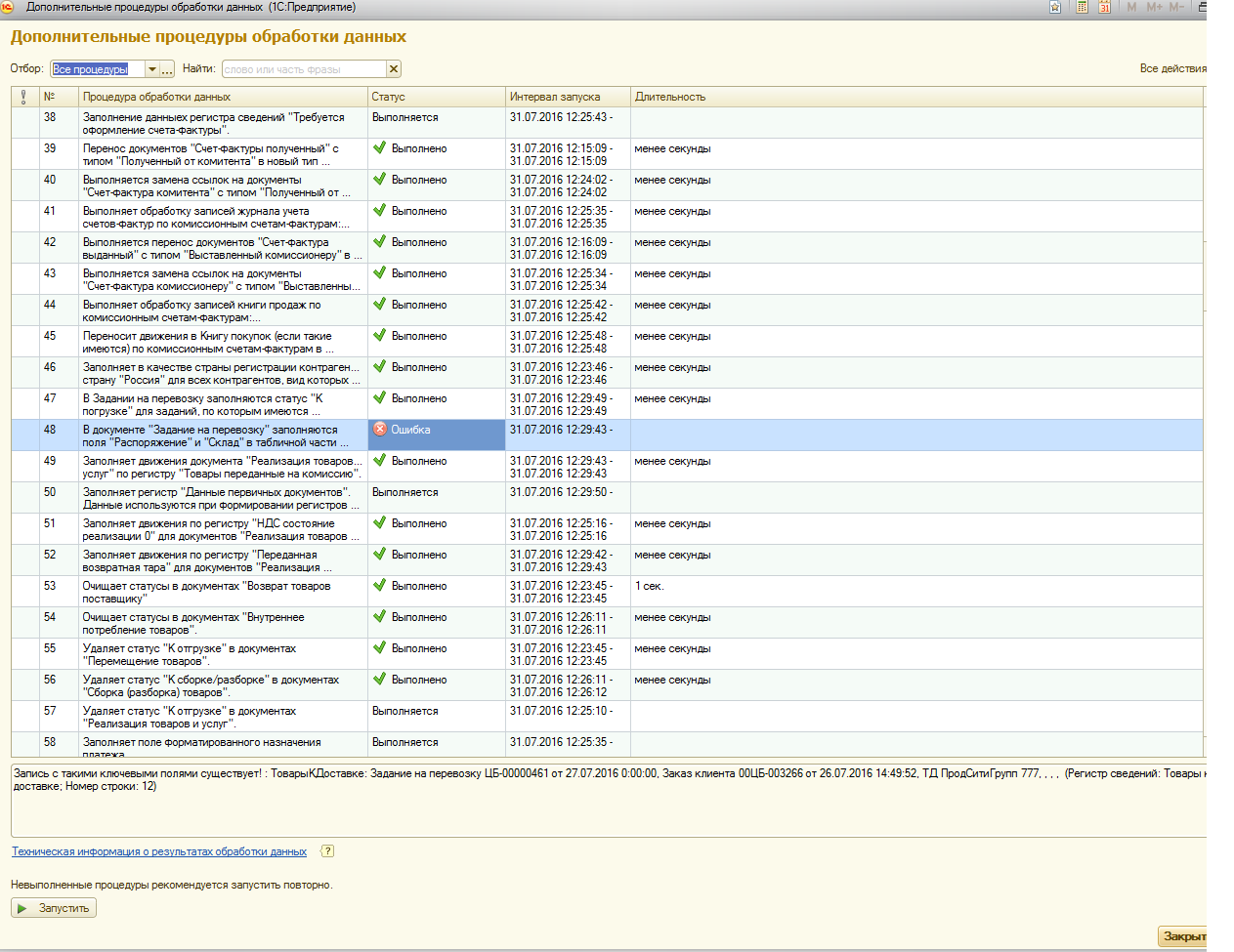 Ошибка всегда одна и та же. Ругается на Документ задание на перевозку и Документ Заказ клиента, ну и Регистр ТоварыКДоставке. То есть, если убрать (удалить полностью из базы те документы, которые указаны в ошибке, то потом выскочат другие. Скрин сделан при обновлении УТ 11.1.10.199 до УТ 11.2.2.116. Соответственно дальше если обновлять, то не прокатит. Будет ошибка, что не выполнены все обработки при прошлом обновлении.