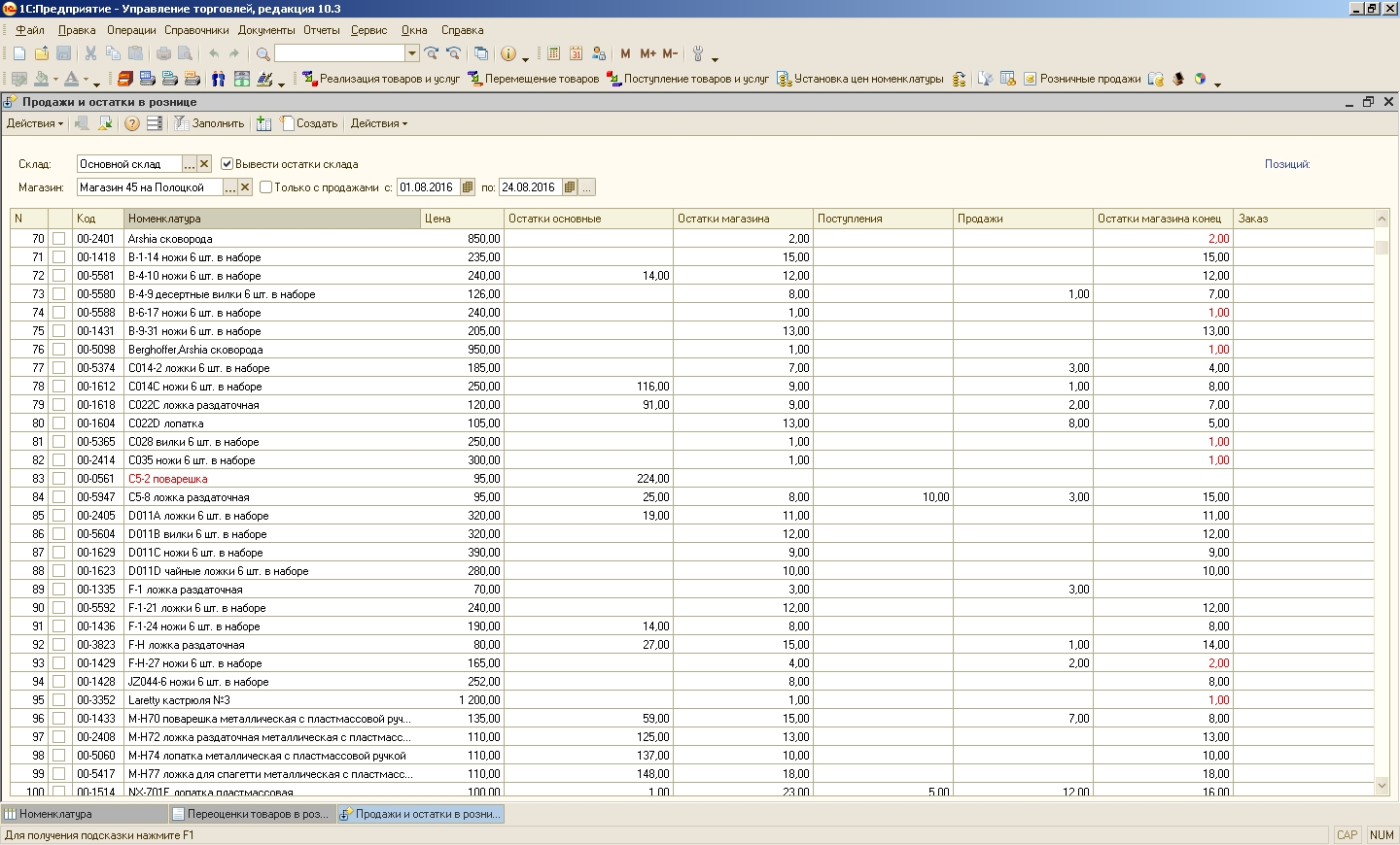 Хотелось бы чтобы такой товар отображался в колонке с остатками номенклатуры оптового склада и выделялся цветом. Рядом с колонкой остатков номенклатуры оптового склада добавить колонку, в которой бы для таких позиций номенклатуры отображались розничные склады, на которых этот товар есть в наличии. Если возможно, хотелось бы чтобы эти склады отображались в ячейке выпадающим списком и, при выборе определённого розничного склада, остатки на нём обновлялись в ячейке "Остатки основные".