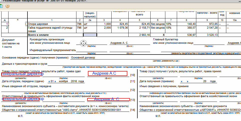 2. Скорректировать УПД (реализация товаров) как в файле во вложении "ТЗ_УПД_Гендир.png"