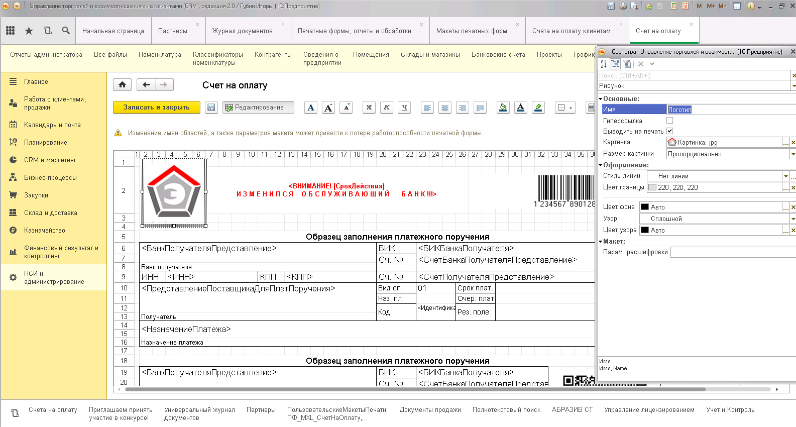 Добавление изображения в макет печатной формы счета