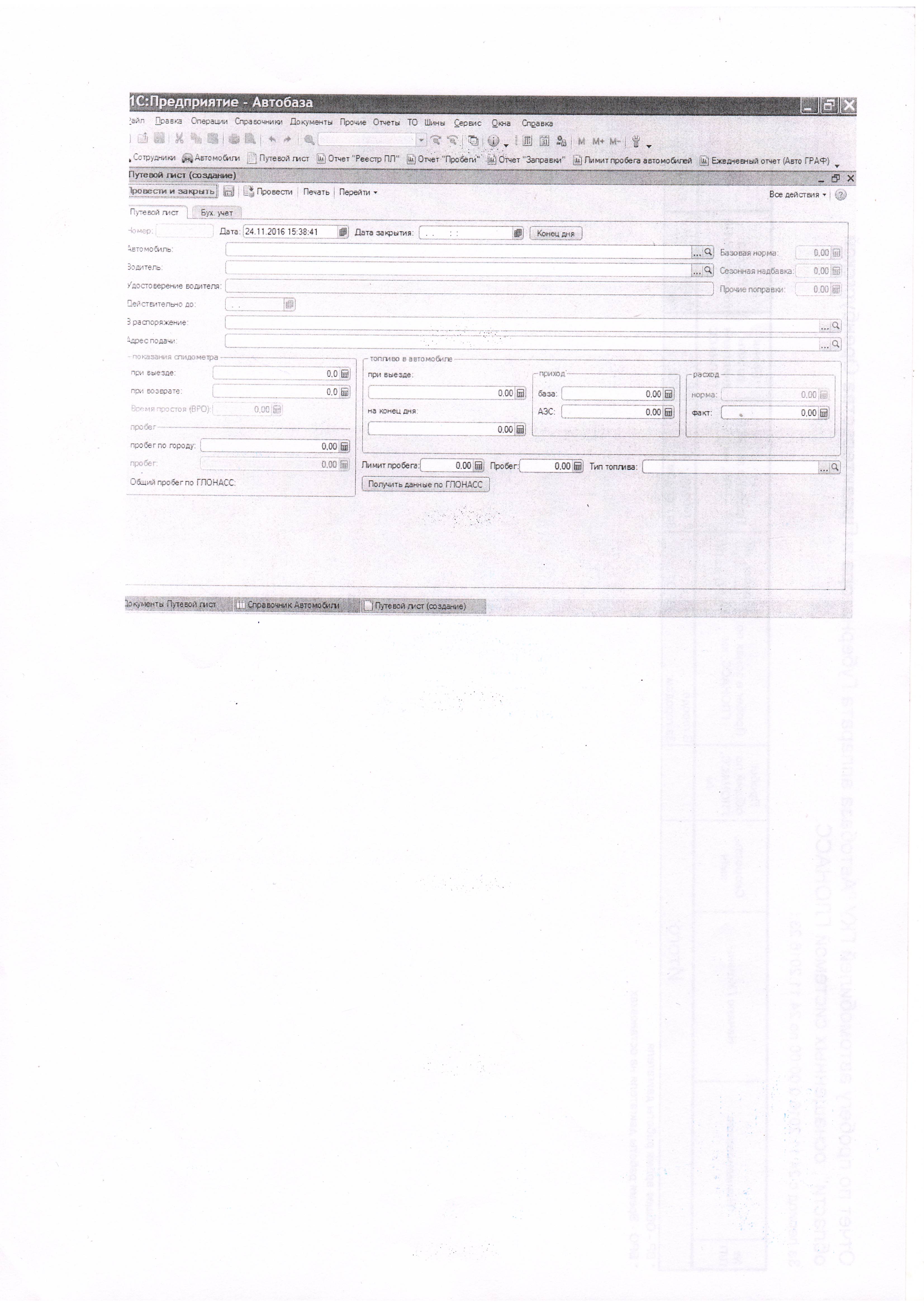  документа «Путевой лист», путём загрузки в редактируемый пользователем документ «Путевой лист» значения времени работы двигателя во время стоянок, значение общего пробега автомобиля и пробега внутри городской черты (внутри выделенной геозоны), полученных по данным системы мониторинга, по указанному автомобилю и периоду путевого листа, и дальнейшее использование полученных значений в расчёте списания топлива при закрытии путевого листа.