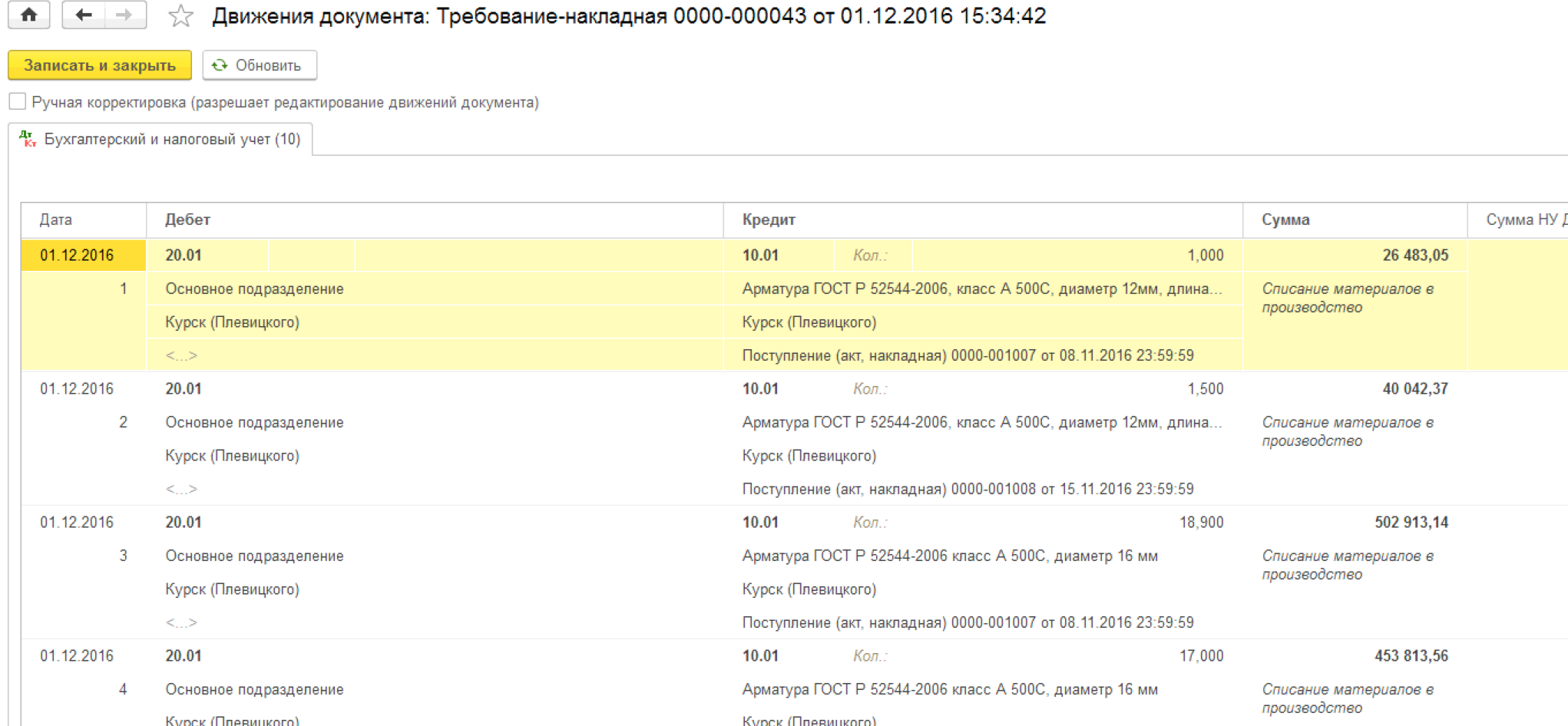 Если по одной позиции номенклатуры несколько списаний партий, то их проссумировать.
