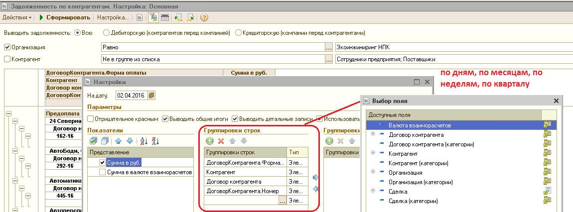Есть типовой отчёт "Задолженность по контрагентам", в группировке не хватает по периодам значений. Исходное и желаемое - во вложении.