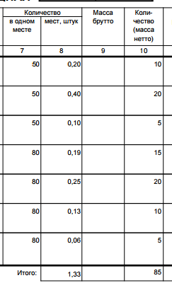 3. Колонка Вес Брутто тоже надо заполнить. Брать из упаковки, умножать на количество. То есть если для упаковки вес указан "100" - в колонку попадет "9"