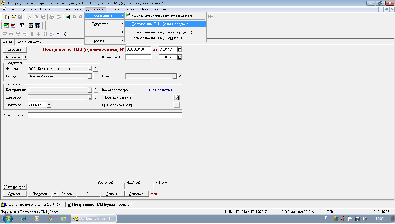 Теперь, после набора товаров в ТМЦ мы возвращаемся в таблицу «Поступление ТМЦ» и должны иметь выбор вывода на печать документа с расположением на каком складе что лежит (Вы уже сделали ранее вывод доп.печатной формы и меню печати «место на складе».