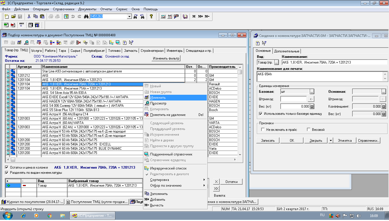 При двойном щелчке мыши товар переносится ниже в таблицу см.рис 4. Если же нужно изменить что-то в описании товара использовать правую кнопку мыши – изменить – попасть в карточку товара см.рис 5. Теперь, самое интересное см.рис 6 – добавить кнопку-список выпадающий с выбором «место склад» и ниже поле для внесения комментариев «где лежит».