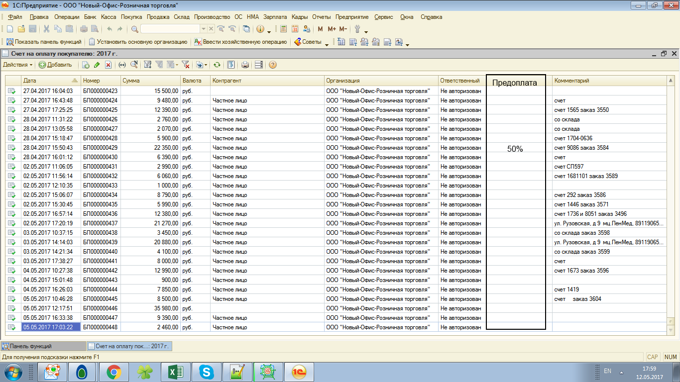 1. В списке счетов ввести новую колонку где будет процент от предоплаты. Например клиент оплатил 5000 из 10000 стоимости - в колонке пишется 50%. (Я так понял программа это должна определять по приходному кассовому ордеру - еще уточню этот момент ) - картинка 1