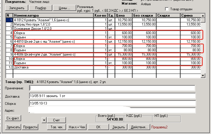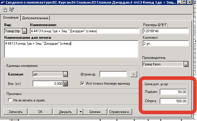 УТ 10.3. Мы занимаемся продажей готовой корпусной мебели. Предлагаем услуги Сборки и Подъема на этаж. У каждой номенклатурной позиции своя стоимость Сборки и Подъема.