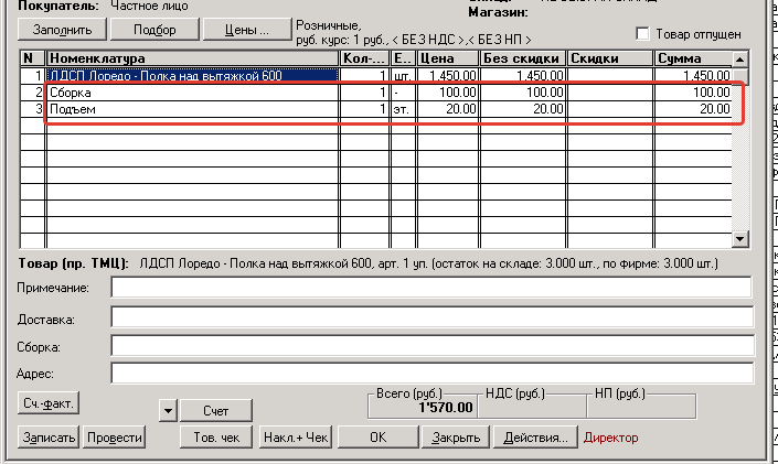 1. Привязать к каждому товару в номенклатуре свою ЦЕНУ услуг Сборки и Подъема.