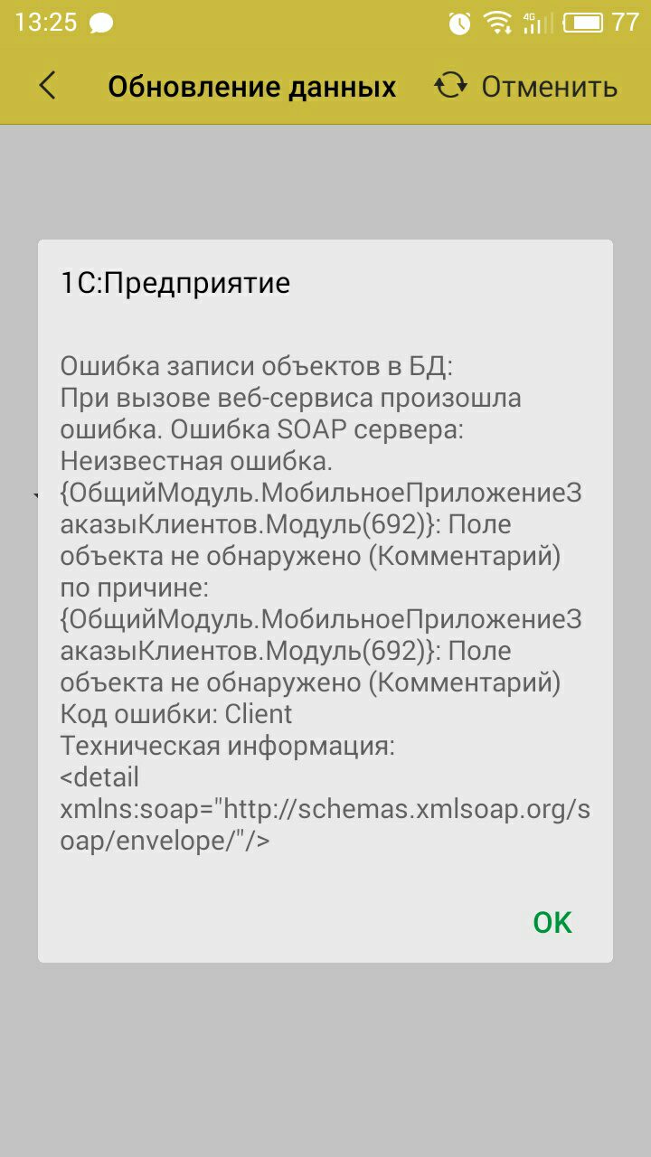 Обмен на данный момент проходит, клиенты, товары, цены и остатки выгружаются из УТ в 1С Заказы. При отправке заказа из мобильного приложения в УТ 11.1 выходит ошибка: