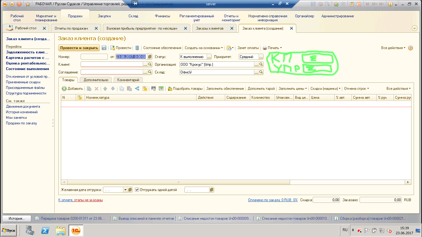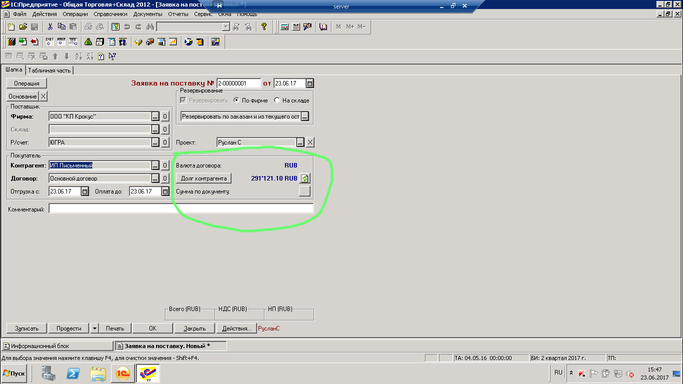 Требуется добавить в форму заказа клиента вывод задолженности из сводной ведомости по двум организациям.