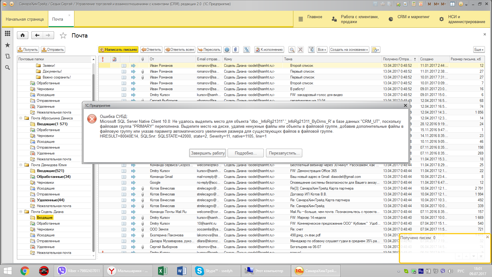 Стоит база версия SQL Express с ограничением в бесплатной версии до 10 ГБ. Необходимо освободить место для загрузки почты, т.к. на данный момент после запуска загрузки писем в 1С, появляется ошибка базы данных SQL.