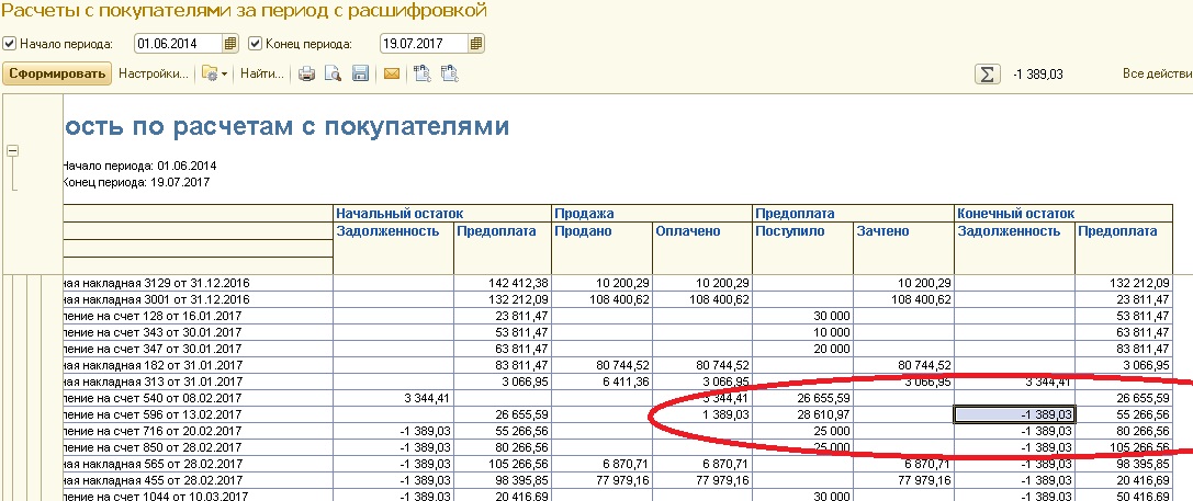 В базе стоит доработка автоматического зачета авансов при проведении документа (расходная накладная, поступления денег и т.д). Зачет авансов происходит по стандартной механизму (как будто нажимаем кнопки подобрать и заполнить). Проблемы возникают в перепроведении старых документов. Т.е. если на 15.02.17 по контрагенту переплата 5000 руб, и мы проводим от него еще оплату - переплата должна только увеличиться, а 1С начинает цеплять расходные накладные будущих периодов, например за июнь 2017 года. Помимо этого, если мы зачли какую-то расходную накладную в поступлении на счет, то эта накладная больше не должна нигде зачитываться, а она может почему-то снова повторно появиться и получается в отчете долг и за нами и за контрагентом.