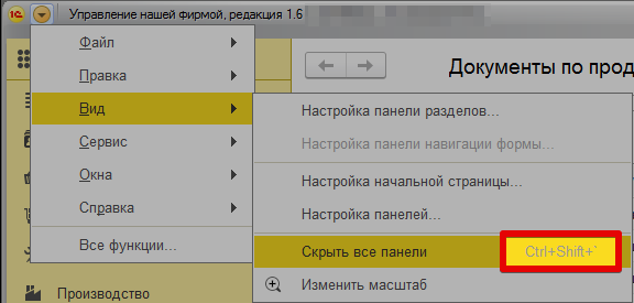 В конфигурации УНФ в меню Вид есть команда "Скрыть все панели", которая показывает или скрывает панели.