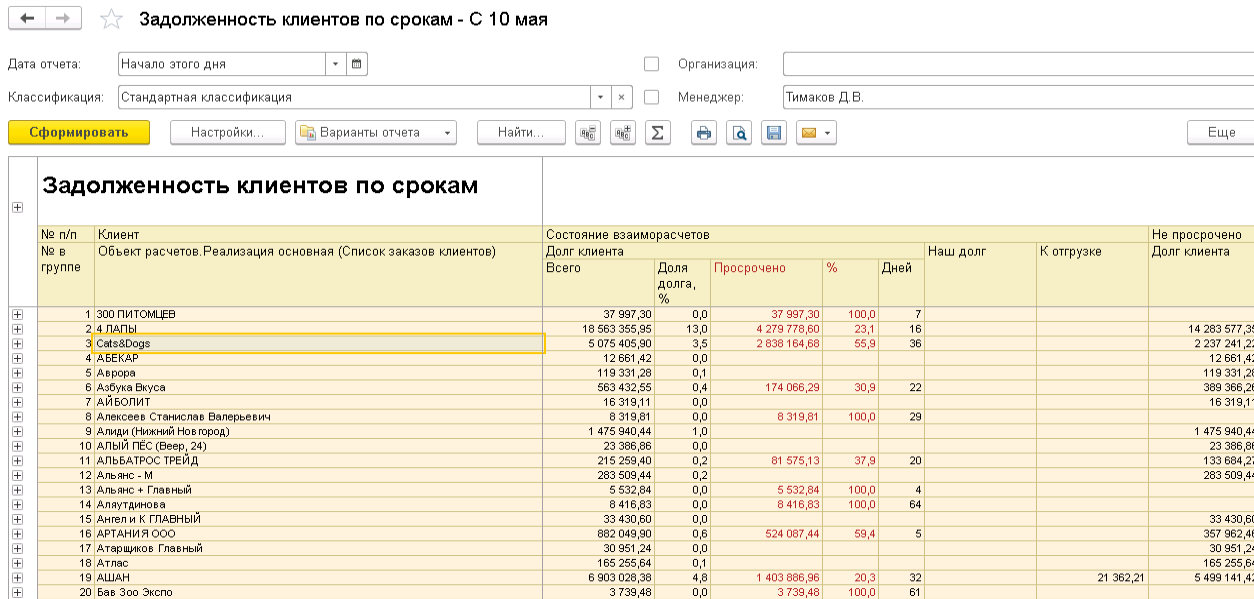 Требуется запрос, который сформирует сегмент клиентов, у которых просроченная задолженность больше 30 дней. Проверка по отчету в приложенном скриншоте.