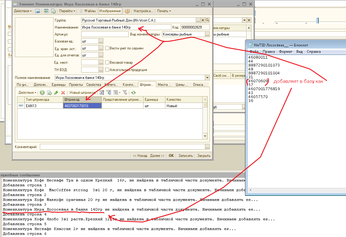 Сегодня выяснилась ошибка - в текстовом файлике один штрихкод а обработка добавляет совсем другую позицию...