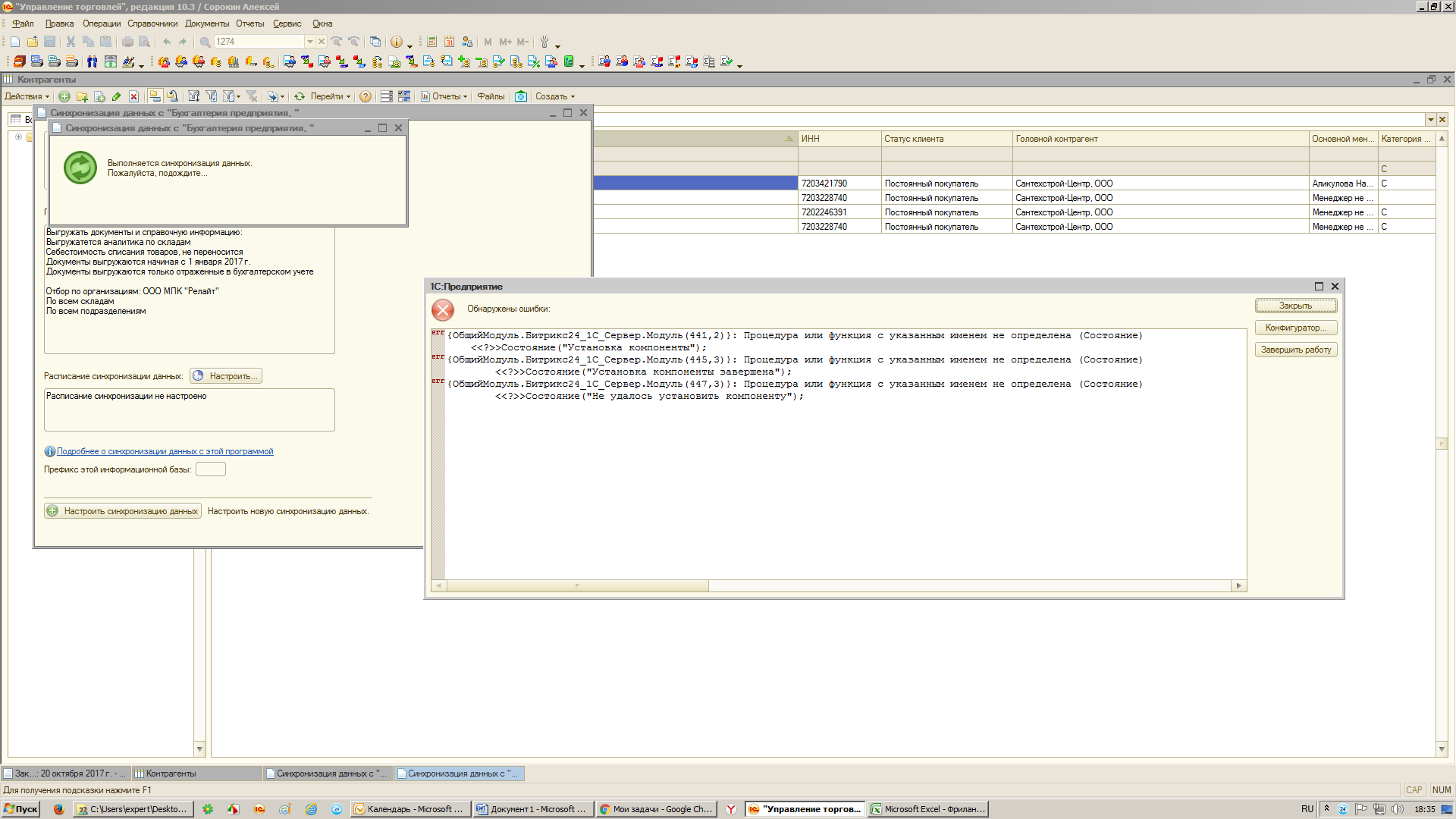 При синхронизации с бухгалтерией выходит ошибка рис.1, данная проблема появилась после попытке «исполнителя» настроить обмен с Бириксом24 до этого все работало. Задача исправить ошибку что бы обмен работал корректно