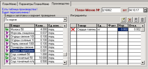 В подразделении ГВСУ в плане-меню(файл прикреплен) есть позиция Гуляш " Аппетитный" в него уже входит сердце говяжье 0,63, программа приготовила и списала. Почему программа приготовляет еще 0,001 порцию которой не должно быть и это количество выходит в минус и дает красноту , что недопустимо в отчетах . Этот минус отображается в инвентаризационных ведомостях.