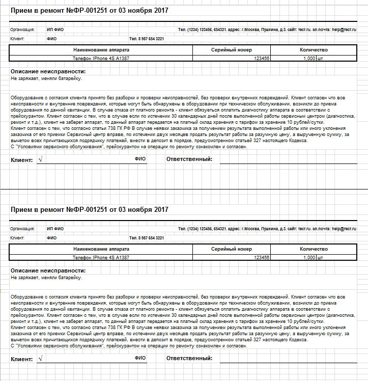 Нужно сделать внешнюю печатную форму накладной "Прием в ремонт" по образцу.