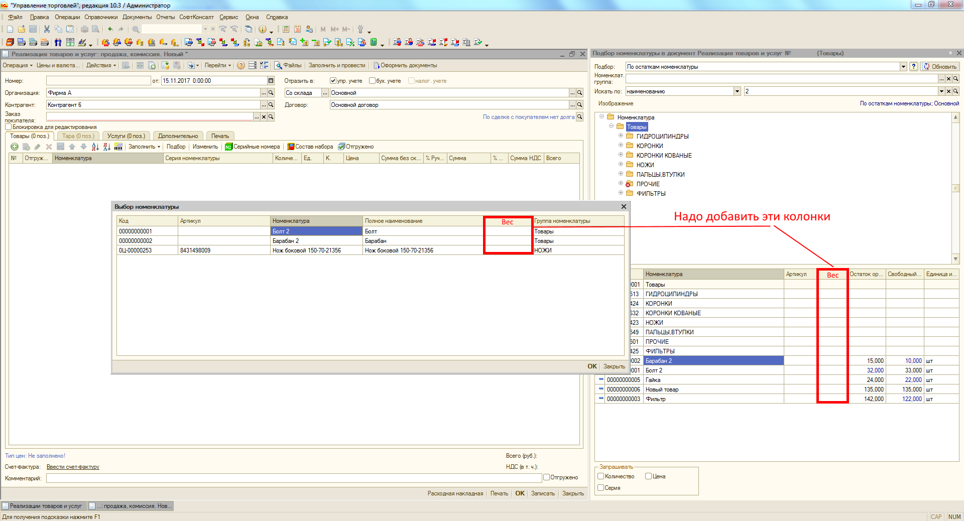 2. Добавить колонку Вес также в список Выбор номенклатуры, который открывается, когда мы что-то ищем в подборе.