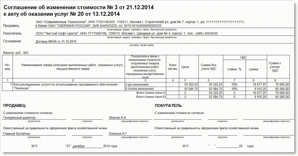 Печатная форма соглашения об изменении стоимости для Бухгалтерии 2.0